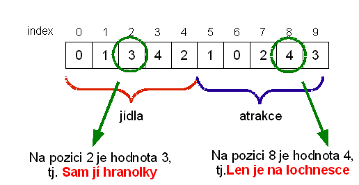 Index prvku určuje osobu (jméno). Přiřazení čísel jménům, jídlům a atrakcím definuje následující tabulka 2.